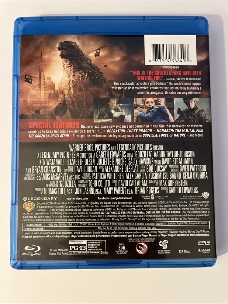 Experience the thrill of the classic science fiction horror movie "Godzilla" in stunning Blu-ray quality. This edition includes both English and French audio, as well as Spanish subtitles, making it accessible to a wider audience. Directed by Gareth Edwards, this 2014 release is rated PG-13 and features the iconic Godzilla monster in a terrifying and action-packed battle. The Blu-ray and DVD combo pack is perfect for movie collectors and fans of the genre. This item is categorized under "Movies & TV" and "DVDs & Blu-ray Discs". Get your hands on this exciting edition and relive the suspense and drama of "Godzilla" over and over again. Will combine shipping with other DVDs. Ships media mail.
