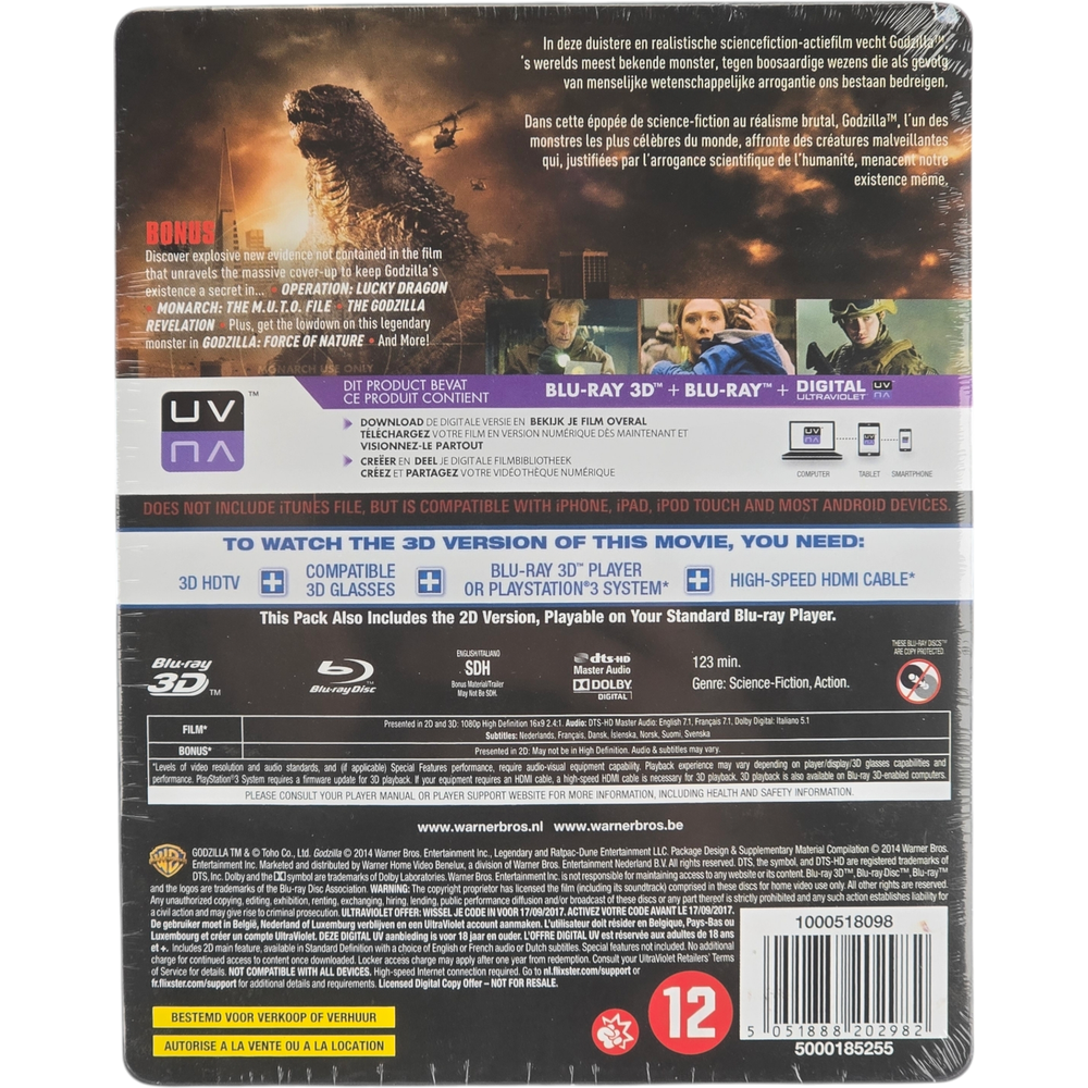 Godzilla Steelbook Blu-ray 3D + Blu-ray Limited edition Zone B Exit year: 2014 Manufacturing year: 2015 Country of manufacture: The Netherlands Content 2 discs: 3D Blu-ray, Blu-ray 2D Packaging Steelbook, limited edition Reading (regions) Zone B 3D Blu-ray 3D Blu-ray audio English: DTS-HD MA 7.1 French: DTS-HD MA 7.1 German: DTS 5.1 Italian: Dolby Digital 5.1 3D Blu-ray subtitles English SDH French German Dutch Other languages: Danish, Finnish, Swedish Blu-ray 2D 2D Blu-ray audio English: DTS-HD MA 7.1 French: DTS-HD MA 7.1 German: DTS 5.1 Italian: Dolby Digital 5.1 2D Blu-ray subtitles English SDH French German Dutch Other languages: Danish, Finnish, Swedish Video Codec: MPEG-4 MVC, Resolution: 1080p, ratio: 2.40: 1 Bonus Making-of, cut scenes, audio comment, documentaries Director Gareth Edwards Actors Aaron Taylor-Johnson, Ken Watanabe, Bryan Cranston, Elizabeth Olsen ️ genre Action, science fiction Studio Warner Bros. Classification +12 years Godzilla Steelbook Blu-ray 3D + Blu-ray Limited edition Zone B Exit year: 2014 Manufacturing year: 2015 Country of manufacture: The Netherlands 2 discs: 3D Blu-ray, Blu-ray 2D Steelbook, limited edition Reading (regions) 3D Blu-ray audio English: DTS-HD MA 7.1 French: DTS-HD MA 7.1 German: DTS 5.1 Italian: Dolby Digital 5.1 3D Blu-ray subtitles Other languages: Danish, Finnish, Swedish 2D Blu-ray audio English: DTS-HD MA 7.1 French: DTS-HD MA 7.1 German: DTS 5.1 Italian: Dolby Digital 5.1 2D Blu-ray subtitles Other languages: Danish, Finnish, Swedish Codec: MPEG-4 MVC, Resolution: 1080p, ratio: 2.40: 1 Making-of, cut scenes, audio comment, documentaries Gareth Edwards Aaron Taylor-Johnson, Ken Watanabe, Bryan Cranston, Elizabeth Olsen Action, science fiction Classific