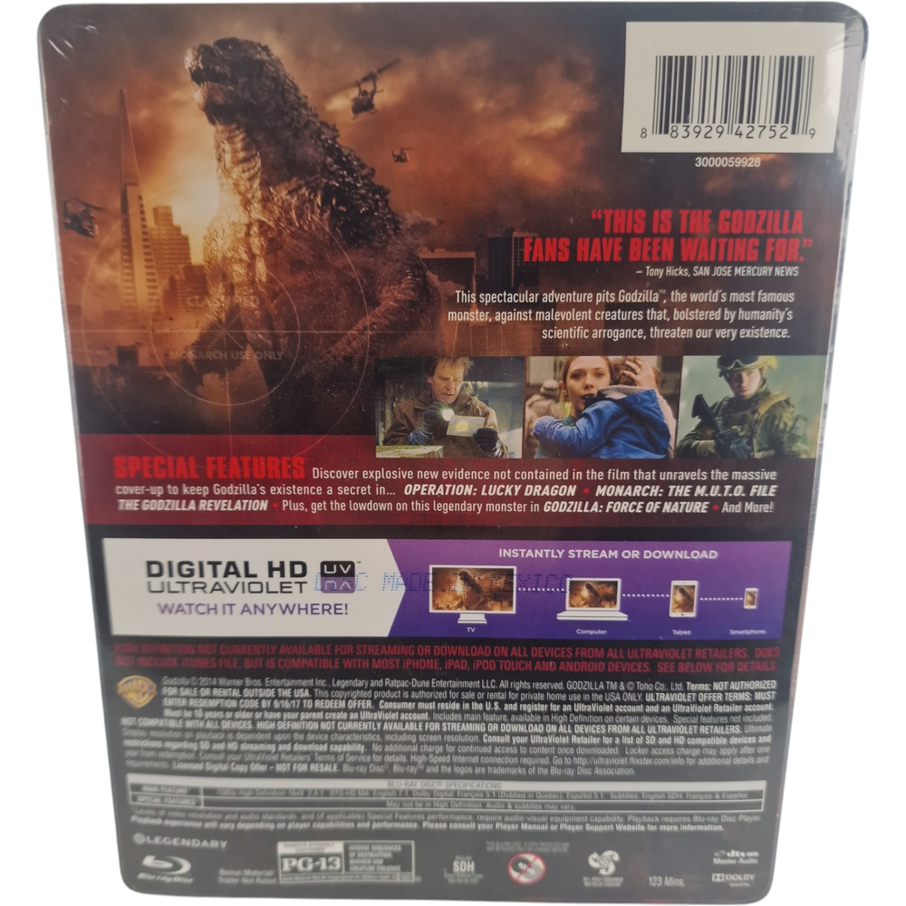 Godzilla Blu-Ray Steelbook Débossé Metalpak Blu-Ray + DVD Edition Limited Area A The description of this item has been automatically translated. If you have any questions, please feel free to contact us. Godzilla Blu-ray Steelbook Debossed MetalPak Blu-ray + DVD Limited edition Zone A Audio English: DTS-HD Master Audio 7.1 (48kHz, 24-bit) Spanish: Dolby Digital 5.1 French: Dolby Digital 5.1 Subtitles English SDH, French, Spanish Discs Blu-ray Disc Two-disc set (1 BD-50, 1 DVD) DVD copy Digital Digital copy included Packaging MetalPak, Embossed Print, Interior Print Reading 2K Blu-ray: Region A Godzilla Blu-ray Steelbook Debossed MetalPak Blu-ray + DVD Limited edition Zone A Audio English: DTS-HD Master Audio 7.1 (48kHz, 24-bit) Spanish: Dolby Digital 5.1 French: Dolby Digital 5.1 Subtitles English SDH, French, Spanish Discs Blu-ray Disc Two-disc set (1 BD-50, 1 DVD) DVD copy Digital Digital copy included Packaging MetalPak, Embossed Print, Interior Print Reading 2K Blu-ray: Region A Marque Warner Bros. Numéro de pièce fabricant S1441 Pays de fabrication France EAN 883929427529
