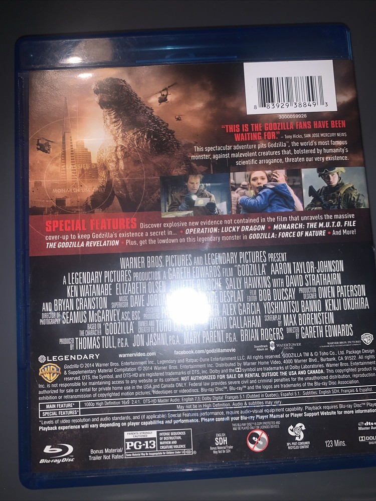 Experience the thrilling science fiction horror film, Godzilla, in high definition on Blu-ray. Directed by Gareth Edwards, this movie takes you on a journey through a parallel world filled with danger and destruction. The film, released in 2014, has a PG-13 rating and comes with English, French, and Spanish subtitles. This Blu-ray disc is perfect for collectors and fans of the genre. The movie, produced by Warner Home Video, is presented in stunning format and is a must-have for any movie lover's collection. Get ready to witness the epic battle between Godzilla and his opponents, and immerse yourself in the world of science fiction horror. As shown in photos Domestic shipping only