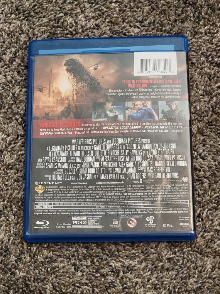 *Item is pre-owned, the actual disc(s) may or may not have scratches. The product is the Blu-ray edition of the movie "Godzilla" released in 2014. Directed by Gareth Edwards, this science fiction horror film stars a monster known as Godzilla. The movie is rated PG-13 and features English as the main language with subtitles available in English, French, and Spanish. Produced by Warner Home Video, this edition offers high-quality visuals and sound for an immersive viewing experience of the epic battle between Godzilla and other monstrous creatures. 278