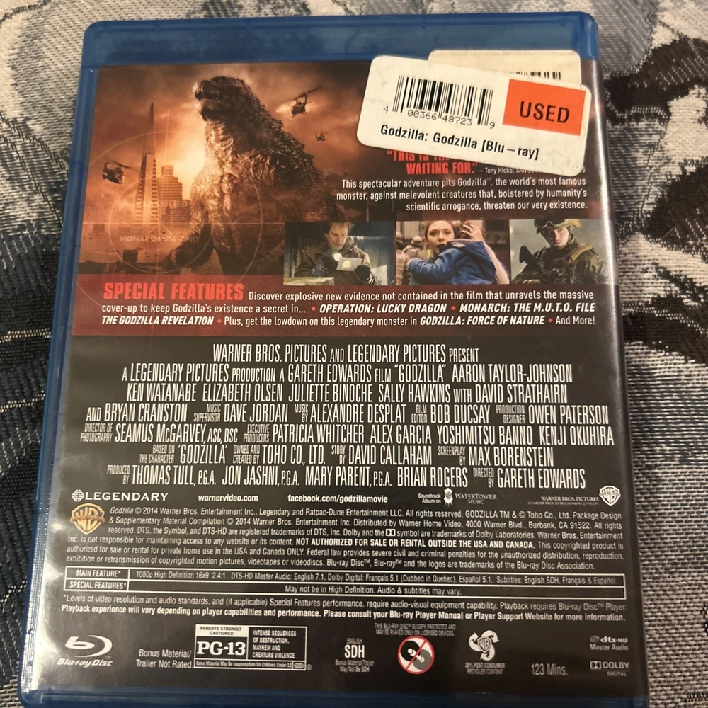This Blu-ray disc features the 2014 release of the classic science fiction and horror movie, Godzilla. The film is rated PG-13 and was produced by Warner Home Video. It is presented in the Blu-ray format and was released in 2014. The movie follows the iconic monster as it wreaks havoc on the city, and is sure to entertain fans of the genre. The disc also includes special features and bonus content. Get ready to experience the thrill of the legendary Godzilla!
