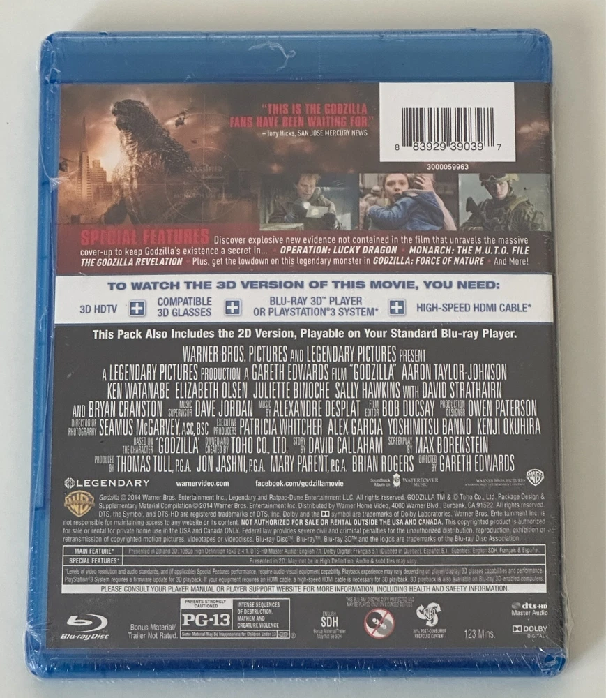 This is the blu-ray 3D for Godzilla (2014). This blu-ray is brand new! *NOTE*: To watch the 3D version, you must have compatible equipment. Please see the back cover (Image 2) for more details. The 2D version is also included. Shipping is only within the U.S. If you have any questions, don't hesitate to ask. Thanks for taking a look!