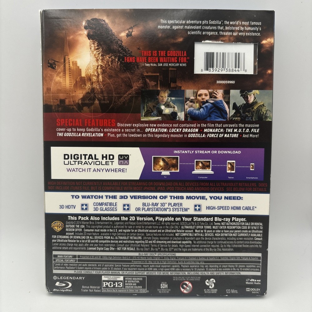 Godzilla (Blu-ray, 3D, DVD, 2014) Aaron Taylor-Johnson, Ken Watanabe, PG-13. Condition is Good. Shipped with USPS Media Mail.
