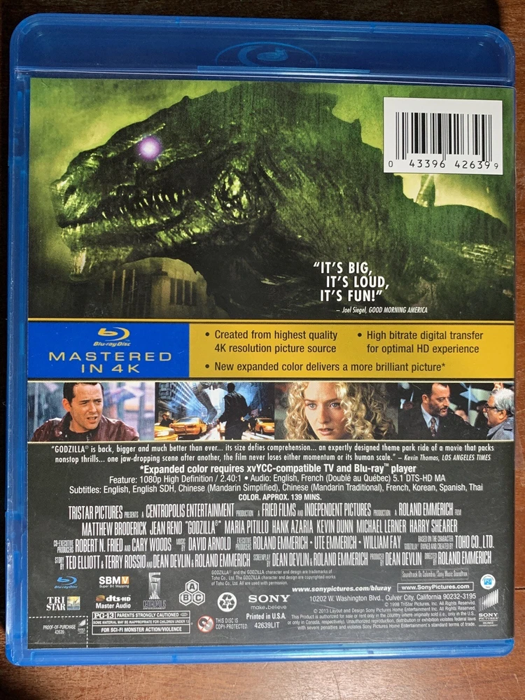 This Blu-ray edition of the famous sci-fi and fantasy movie "Godzilla" directed by Roland Emmerich is a must-have for any collection. The film is rated PG-13 and comes in the Blu-ray disc format, ensuring top-quality picture and sound. The movie tells the story of Godzilla, the gigantic monster that emerges from the ocean to wreak havoc on New York City. With stunning visual effects and a thrilling storyline, this movie is perfect for fans of the genre. Don't miss out on the chance to own this epic film in high definition.