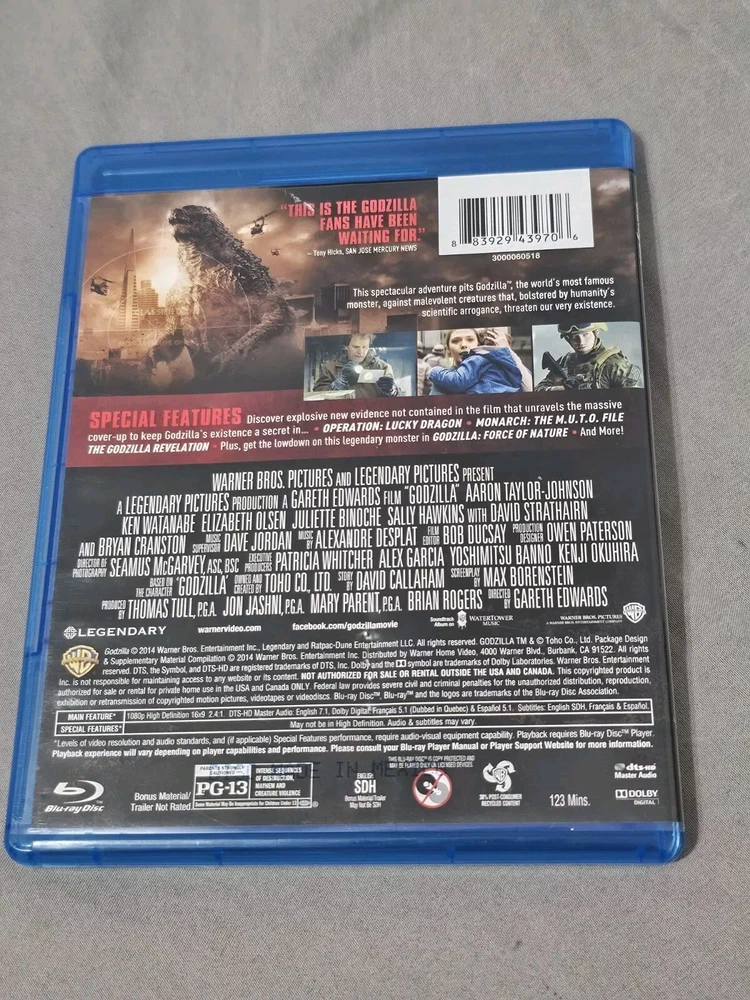 Godzilla is a 2014 American monster film directed by Gareth Edwards. Produced by Legendary Pictures and distributed by Warner Bros. Pictures, it is a reboot of Toho's Godzilla franchise, and the first film in Legendary's Monsterverse franchise. In very good condition, digital code is expired. Very small damaged on the back cover (see photos). In english, french and spanish Region A/1 ntsc Shipping in Canada and USA only I don't combine shipping