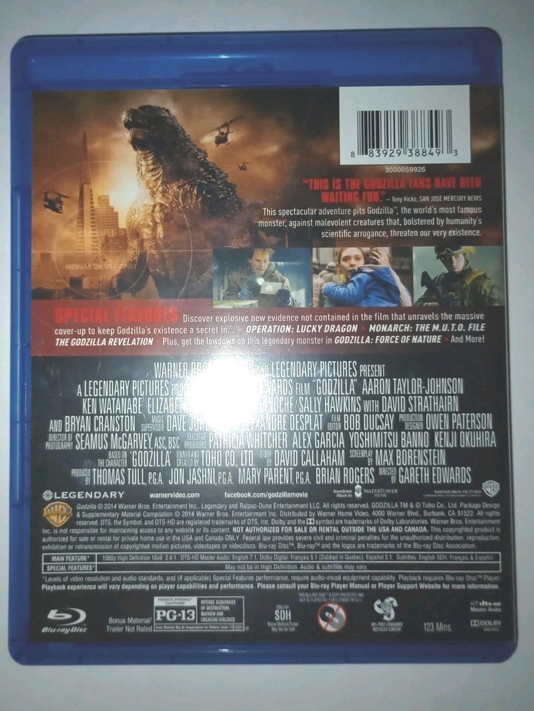 This combo pack of Godzilla on Blu-ray and DVD is a must-have for any monster movie fan. Directed by Gareth Edwards and featuring Elizabeth Olsen, this science fiction horror film is sure to keep you on the edge of your seat. The pack includes exclusive features such as a behind-the-scenes featurette and widescreen format for an enhanced viewing experience. With subtitles available in English, French, and Spanish, this movie is accessible to a wide range of audiences. Rated PG-13, it's a great addition to any movie collection. The Blu-ray case ensures the safe storage of the discs. Don't miss out on this thrilling monster movie!