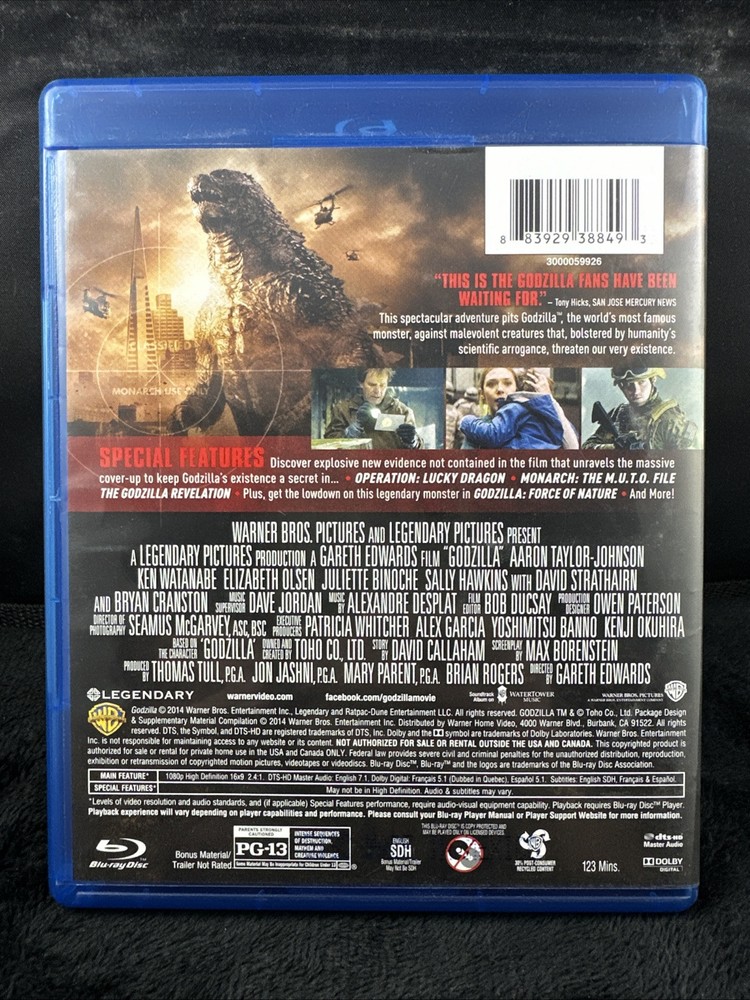 Experience the epic battle of humanity versus the monstrous Godzilla with this Blu-ray DVD combo pack. Directed by Gareth Edwards, this science fiction horror film rated PG-13 will leave you on the edge of your seat. The pack includes English, French and Spanish subtitles, making it accessible to a wider audience. Released in 2014 by Warner Home Video, this movie is a must-have for fans of the genre. The pack includes Blu-ray, DVD and Digital HD Ult Blu-ray formats for ultimate viewing experience. Get your hands on this tested and fully functional combo pack today.