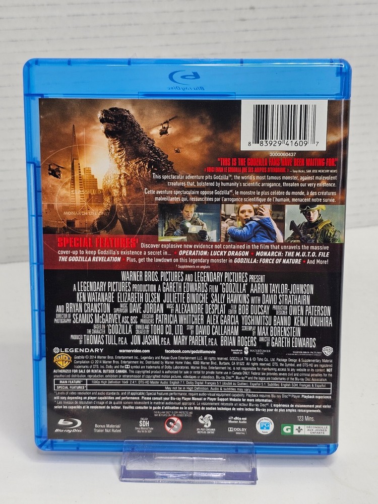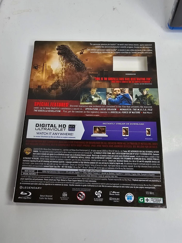 Godzilla Blu-Ray. Canadian. Bilingual. 2014. 123 minutes. Good condition. Includes slip cover. ----------------------------------------------------------------------------------------------------------------------------------- THANK YOU for visiting my ad. Please be sure to check my other listings as COMBINED shipping is encouraged. ----------------------------------------------------------------------------------------------------------------------------------- USA buyers are very much APPRECIATED. ----------------------------------------------------------------------------------------------------------------------------------- Item(s) SHIPPED from CANADA ----------------------------------------------------------------------------------------------------------------------------------- NOTE item(s) are in PRE-OWNED condition ( UNLESS otherwise stated) and may show signs of cosmetic wear on the case, disc, cart, item, etc. ----------------------------------------------------------------------------------------------------------------------------------- PLEASE make sure to view photos for further details and cosmetics. ----------------------------------------------------------------------------------------------------------------------------------- MESSAGE me if you have any questions! ----------------------------------------------------------------------------------------------------------------------------------- Additional Notes: Games with downloadable content may have been redeemed. Taxes are applied at check out automatically based on area of residence. Buyer is responsible for any duty, custom fees, etc. Items sold in Canada may be sent via Canada Post letter-mail with no tracking. US buyers get tracked shipping. ---------------------------------------------------------------------------------------------------------------------------------- As a one-man Canadian operation I do appreciate the business, THANK YOU. 306 Video Games / Lucas