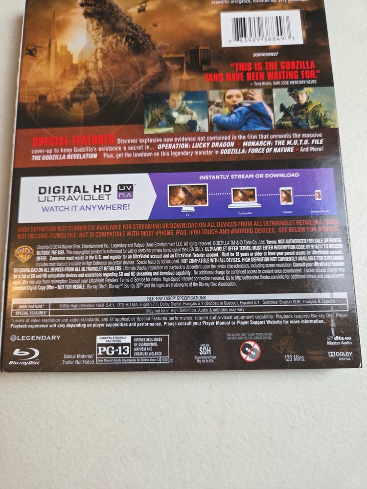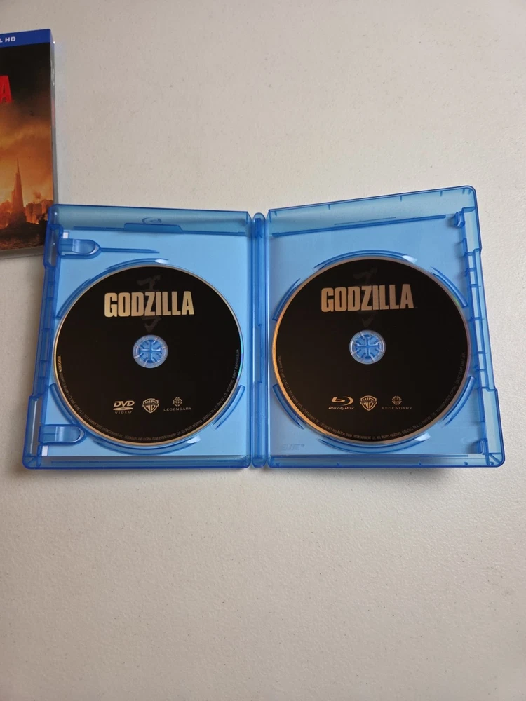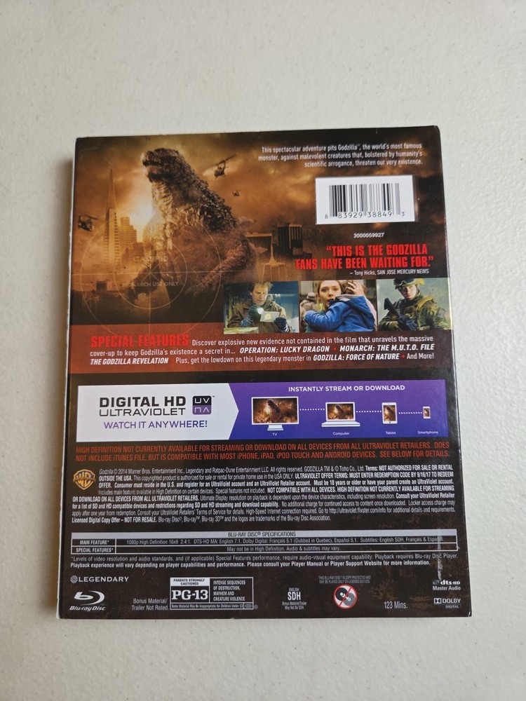 This is a Blu-ray + DVD combo of the movie "Godzilla" directed by Gareth Edwards. It is a PG-13 rated science fiction film released in 2014. The Blu-ray case includes English, French, and Spanish subtitles, and the film is in English language. The region code is DVD: 1 and Blu-ray: A, suitable for US, Canada, and Americas. This product is distributed by Warner Home Video.