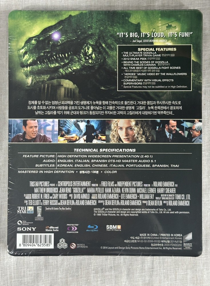 Korea release of Godzilla (1998) Steelbook. Brand New and Sealed. Ultra Limited Release Limited to Only 300 Copies Worldwide. Item will be protected with bubble wrap and shipped in a box. Korea Steelbook release of Godzilla (1998) Brand New and Still Sealed Ultra Limited Release Limited to Only 300 Copies Worldwide Released 2014 Disclaimer All photos are real photos of the actual item, No stock photos are used. Please note, brand new DVD’s, Blu-ray’s, HD-DVD’s, Steelbooks are checked as much as possible from outside the shrink wrap. Any flaws identified will be listed in the ad description and photos will be provided. Imperfections like minor dents and scratches are sometimes impossible to identify without removing the shrink wrap, especially ones that are hidden under a J card. Shipping International Shipping charges represent the actual cost of shipping. We also combine shipping costs if purchasing more than one item. Just purchase 2+ items and request an invoice. We will then send the revised total shipping charge. All Steelbooks are wrapped in bubble wrap and packed in a cardboard box for shipping to ensure they arrive safely. International Buyers please note: Import duties, taxes, and charges are not included in the item price or shipping cost. These charges are the buyer's responsibility. Please check with your country's customs office to determine what these additional costs will be prior to bidding or buying. Region Codes Each listing states the Region Code of the item Please note if buying a DVD or Blu-ray it is the buyer’s responsibility to check the region code of their item to ensure that it will play in their country, as a refund cannot be offered where the listing is correct. Blu-ray Region Codes Region A: North America, South America, U.S. Territories, Japan, South Korea, Taiwan, and certain areas of Southeast Asia. Region B: Europe, Africa, Middle East, Australia, and New Zealand. Region C: Asia (except for Japan, Korea, Taiwan, and certain areas of Southeast Asia) DVD Region Codes Region 1: USA, Canada Region 2: Japan, Europe, South Africa, Middle East, Greenland Region 3: South Korea, Taiwan, Hong Kong, parts of South East Asia Region 4: Australia, New Zealand, Latin America (including Mexico) Region 5: Eastern Europe, Russia, India, Africa Region 6: China Region 7: Reserved for unspecified special use. Region 8: Reserved for cruise ships, airlines, and other international venues. Region 0 or Region ALL: Discs are uncoded and can be played worldwide. However, you must play PAL discs in a PAL-compatible unit and NTSC discs in an NTSC-compatible unit. Feel free to ask questions and check out my other items.