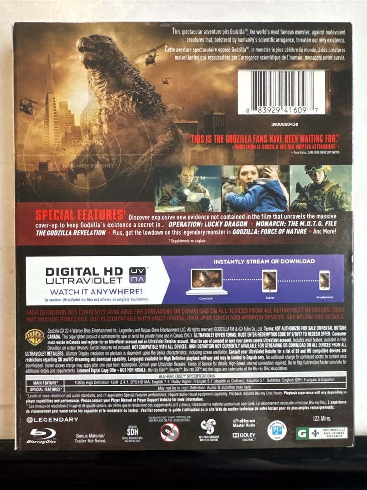 Experience the epic battle between man and monster with the 2014 film "Godzilla" on Blu-ray. Immerse yourself in the stunning visuals and powerful performances that brought this classic creature to life. With a runtime of 123 minutes, this Standard Edition is perfect for fans of the franchise and newcomers alike. Directed by Gareth Edwards and featuring an incredible cast including Bryan Cranston and Elizabeth Olsen, this Sci-Fi & Fantasy adventure is available in bilingual (English, French, and Spanish) audio with subtitles in the same languages to cater to a diverse audience. Enjoy this rare, out-of-print gem that is a must-have for any movie collection.