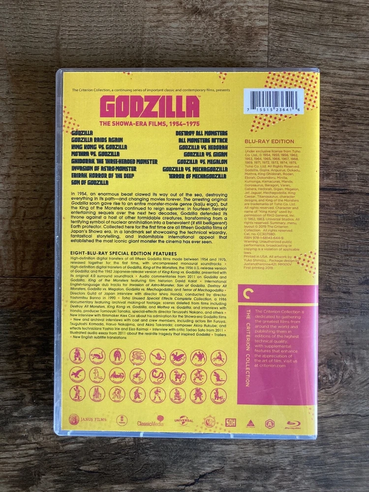 You're buying a Custom Blu-ray Covers of The Godzilla Collection: Showa-Era (No Discs are included). The case included is an 8-Disc empty DVD-sized case with a 22mm spine. No discs are included. These were made to allow people that bought the original oversized Criterion set and wanted something more compact that fits neat on their shelf. Why store this set across two cases when you can put all 8 discs in one sturdy Godzilla-sized case? Put the original packaging in your bookcase for safekeeping and get your Godzilla films back on the movie shelf. This DVD-sized clear case neatly fits next to your other Criterion releases. It comes with one (8-Disc) empty DVD case. Covers are printed on 28-pound, 100-brightness Hammermill Premium Color Copy paper using my home HP Laser Printer. They are not printed on glossy or thick cardstock. If you encounter quality issues or are unhappy with your prints, feel free to message me before leaving a review. Thank you! SHIPPING: I ship using USPS Priority Mail Flat Rate Small Boxes. The price of shipping is set by the USPS.
