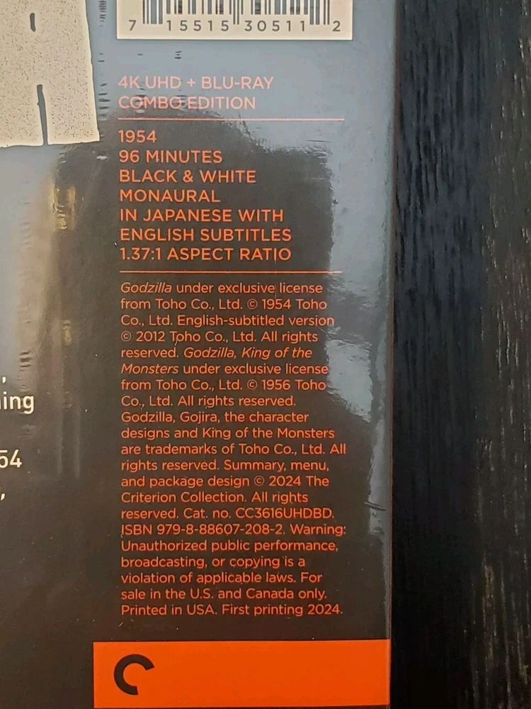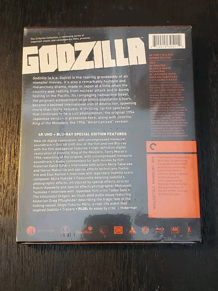 "Godzilla (Criterion Collection)" is a classic Japanese science fiction film directed by Ishiro Honda. This Ultra HD 4K UHD Blu-Ray version of the 1954 original TOHO classic includes English subtitles. The film has a run time of 96 minutes and is presented in a 1.37:1 aspect ratio, providing an immersive viewing experience for fans of action/adventure and science fiction genres. [SMALL TEAR IN FRONT CELLOPHANE, SEE PICS]