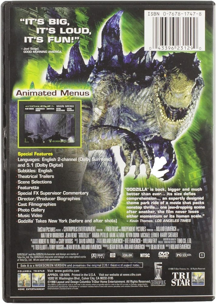 Godzilla [DVD] Product details Aspect Ratio : 2.35:1 Is Discontinued By Manufacturer : No Language : English Product Dimensions : 18.42 x 13.34 x 1.27 cm; 68.04 Grams Canadian Home Video Rating : Parental Guidance (PG) Item model number : MFR043396231290#VG Director : Peter Ramsey, J, Roland Emmerich, Josef Rusnak Media Format : AC-3, Closed-captioned, Dolby, Widescreen, NTSC, Anamorphic, Color, DVD-Video, Special Edition, Subtitled Run time : 2 hours and 19 minutes Release date : Nov. 3 1998 Actors : Matthew Broderick, Jean Reno, Maria Pitillo, Hank Azaria, Kevin Dunn Dubbed: : French Subtitles: : English Language : English (Dolby Digital 5.1), English (Dolby Digital 2.0 Surround), Unqualified Studio : Sony Pictures Home Entertainment Producers : Kevin Grady, Adam Sandler, Jack Giarraputo, Barry Bernardi, Dean Devlin Country of origin : Canada Number of discs : 1 Product description Following the French atomic bomb tests in the South Pacific, an unknown creature is spotted passingwestward through the Panama Canal. Scientist Niko Tatopolous is called in to investigate the matter, and he quickly arrives at the conclusion that a giant, irradiated lizard has been created by the explosions. Godzilla(r) then makes its way north, landing at Manhattan to begin wreaking havoc in the big city. Even with the combined forces of the U.S. military to fight the monster, will it be enough to save the people of New York?