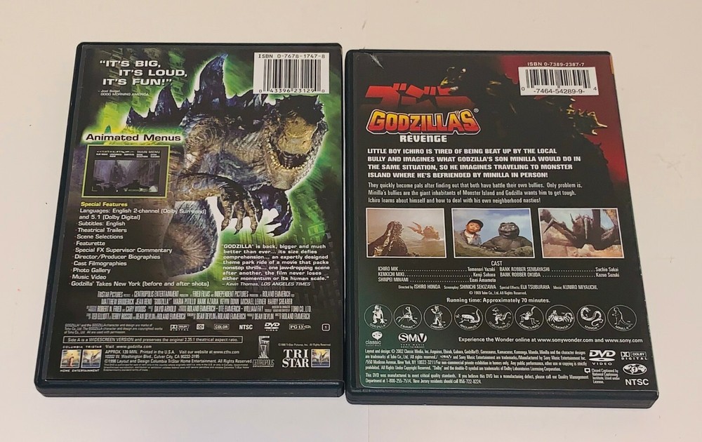 Godzilla (DVD, 1998, Deluxe Widescreen Edition) And Godzilla Revenge 1969 Please read before making a purchase. Please see Photos, If more photos or information is needed, please ask and we will get back to you As soon as we can. We do thank you for checking out our listings, we are not experts, so any descriptions that we may use is our opinion only. We hope that you know what you are looking for, and what your needs are . Please ask as many questions as needed before bidding/buying and we will do our best to answer. This is an auction/buy it now for a possibly new or used item, it is being sold "As Is" as how Auctions go . We will package all items securely to try prevent any damage during shipping. If by chance an issue arises, please contact us before leaving any feedback so we may work together to resolve the issues and come to a conclusion where both parties are happy with he end results. Photos we post in the listings are of the actual item that you will receive unless noted, so please look closely. We reserve the right to change the shipping method from what is shown in the listing. Flat rate shipping price is for the 48 continental states Only Any other US Territory will have additional Shipping fees. International Shipping please use Ebay's Global Shipping Program (GSP) We Combine Shipping for Multiple Auctions, If you buy multiple items we can send you an Invoice prior to paying if possible. We do list a number of auctions with a Pay now feature (Due to an increase number of people buying and not paying), So when you have multiple purchases we will refund the shipping difference back shortly after shipping your items out, That is the most accurate way. Thanks for looking !