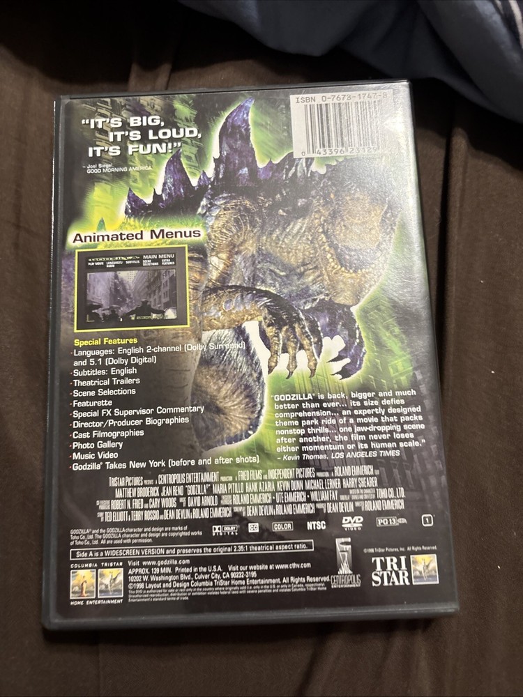 Experience the thrill of Roland Emmerich's science fiction horror classic, "Godzilla," with this deluxe widescreen edition DVD. Released in 1998 by Sony Pictures, this NTSC formatted DVD features English language audio and comes in a tall DVD case. The movie is rated PG-13 and is a must-watch for fans of the genre. This DVD is a great addition to any movie collection and is compatible with region code 1 players (US, Canada, and other countries in North America). With its widescreen feature, viewers can enjoy the movie in its full glory. The DVD also includes special features that provide an insight into the making of the movie. Get your hands on this thrilling movie now!