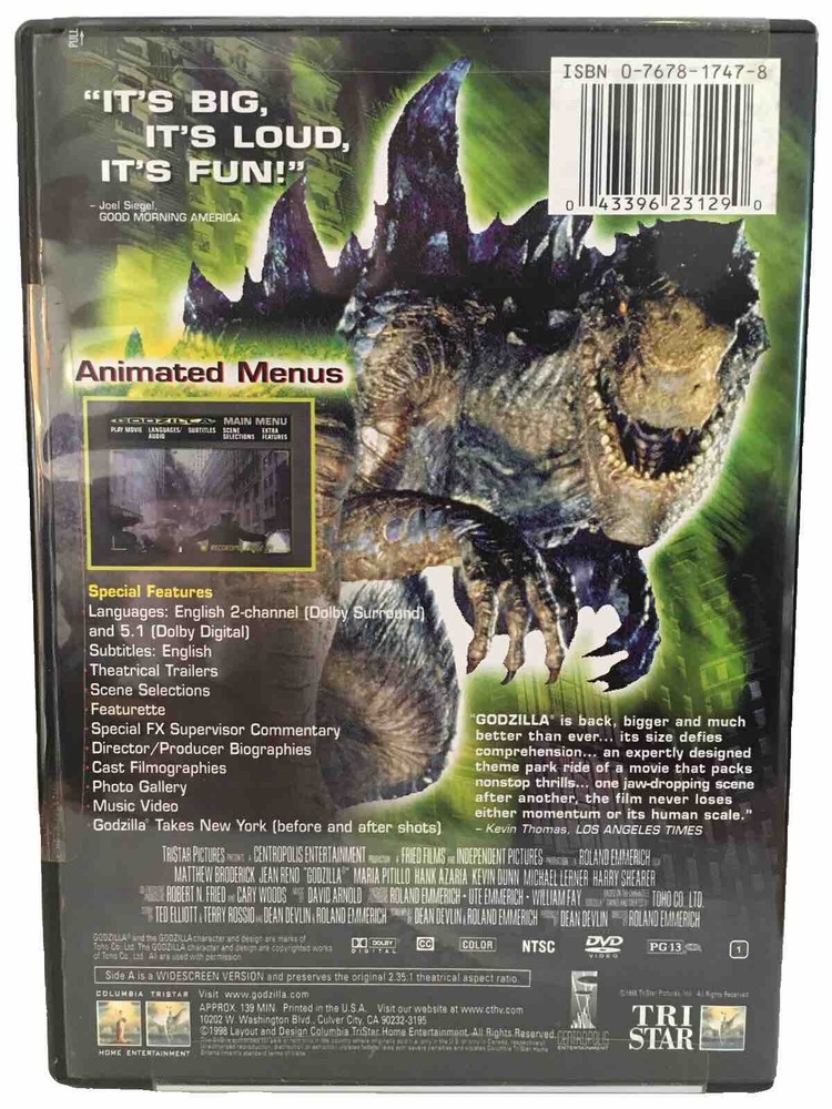 Experience the ultimate monster movie with the 1998 Deluxe Widescreen edition of Godzilla. This DVD features an all-star cast including Matthew Broderick and a range of special features such as commentaries, biographies, and scene selections that will bring you closer to the action. Whether you're a fan of science fiction or just looking for an exciting movie night in, this DVD is perfect for you. From the director of Independence Day, Roland Emmerich, Godzilla is an epic tale of the most famous monster in movie history. With a PG-13 rating, this tall DVD case is a must-have for horror and action movie fans alike. Don't miss out on this opportunity to own a piece of movie history. There is no cellophane. Please see pictures for details and condition. Thank you! It is brand new and factory sealed! 31)