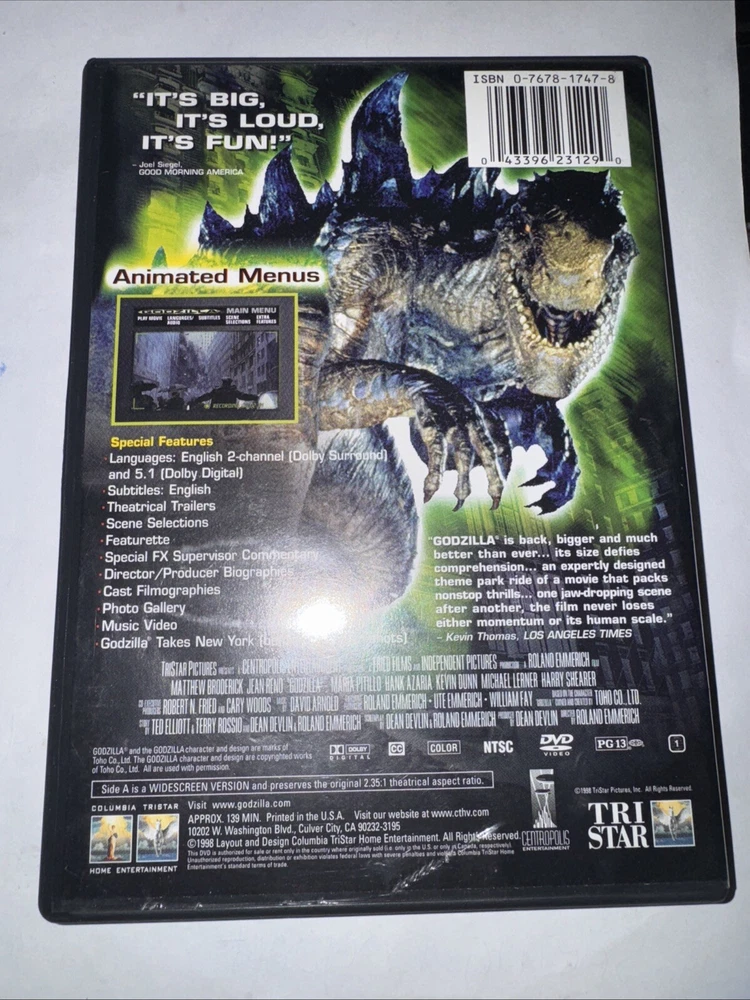 Experience the thrill of the classic horror movie "Godzilla" in deluxe widescreen presentation. Directed by Roland Emmerich and released in 1998 by Sony Pictures, this DVD features a PG-13 rating and is in very good case and inlay condition. The CD grading is also very good and it is a fixed price type. This DVD is perfect for fans of science fiction and horror movies. It has a sub-genre of horror and features widescreen format. The movie/TV title is "Godzilla" and it is categorized under movies and TV, DVDs and Blu-ray discs. Get ready to witness the destruction and chaos caused by this iconic monster. Please note that this item is pre-owned, and while I have taken great care to ensure its quality since it has been in my possession, I cannot guarantee the storage conditions prior to acquiring the item. The item is being sold 'as is,' and I encourage potential buyers to carefully review the photos and description before making a purchase. If you have any questions or concerns, please feel free to reach out, and I will be happy to assist you.