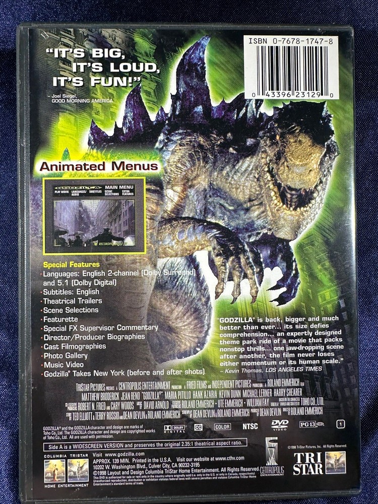 Widescreen excellent condition. Please see all images for condition details. Any questions, please ask. PLEASE SEE MY OTHER ITEMS I utilize mostly recycled packing materials whenever possible (boxes, styrofoam peanuts, bubble wrap, and wrapping paper). If I have utilized bubble wrap, you will find that I have created a pull-tab on the tape I used to secure wrap to facilitate easier removal. CAUTION: Please be aware, I may utilize styrofoam peanuts in the packing of my items. Not only are these annoying when unpacking but can also be a CHOKING HAZARD to small children and pets. If you have these concerns, please take the appropriate precautions as to the surroundings of where you open and unpack your items. This DVD features the 1998 science fiction movie Godzilla, directed by Roland Emmerich and starring Matthew Broderick and Jean Reno. The film is rated PG-13 and comes in a tall/DVD case. The aspect ratio is 16:9 with widescreen features and the video format is NTSC. The DVD is region code 1 (US, Canada...) and was released in 1998 by Sony Pictures. This movie is a must-have for fans of the Godzilla franchise and those who enjoy action-packed science fiction films. The DVD is brand new and sealed, making it a great addition to any collection. Don't miss out on the opportunity to own this classic piece of cinema history.