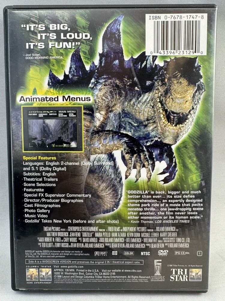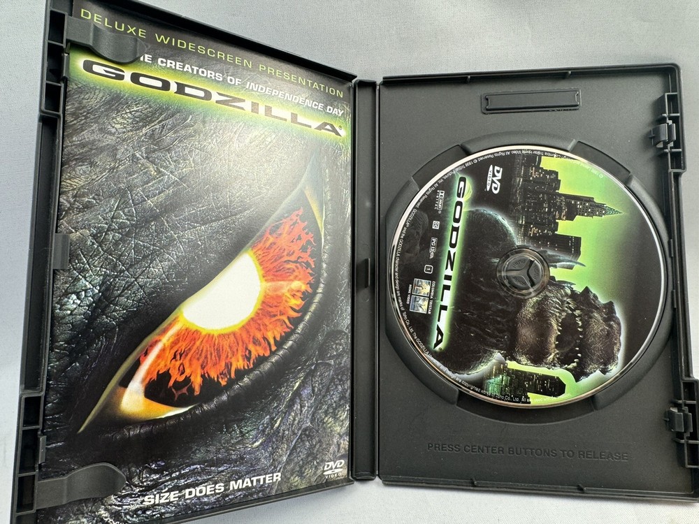 The product is a DVD of the movie "Godzilla," released in 1998 and directed by Roland Emmerich. It is categorized under Science Fiction and Horror genres with a PG-13 rating. The DVD is in very good condition, including the CD grading, case, and inlay. The film is produced by Sony Pictures and is a fixed-price listing. Overall, it offers a well-maintained pre-owned copy of the popular Godzilla movie for fans of science fiction and horror genres to enjoy.