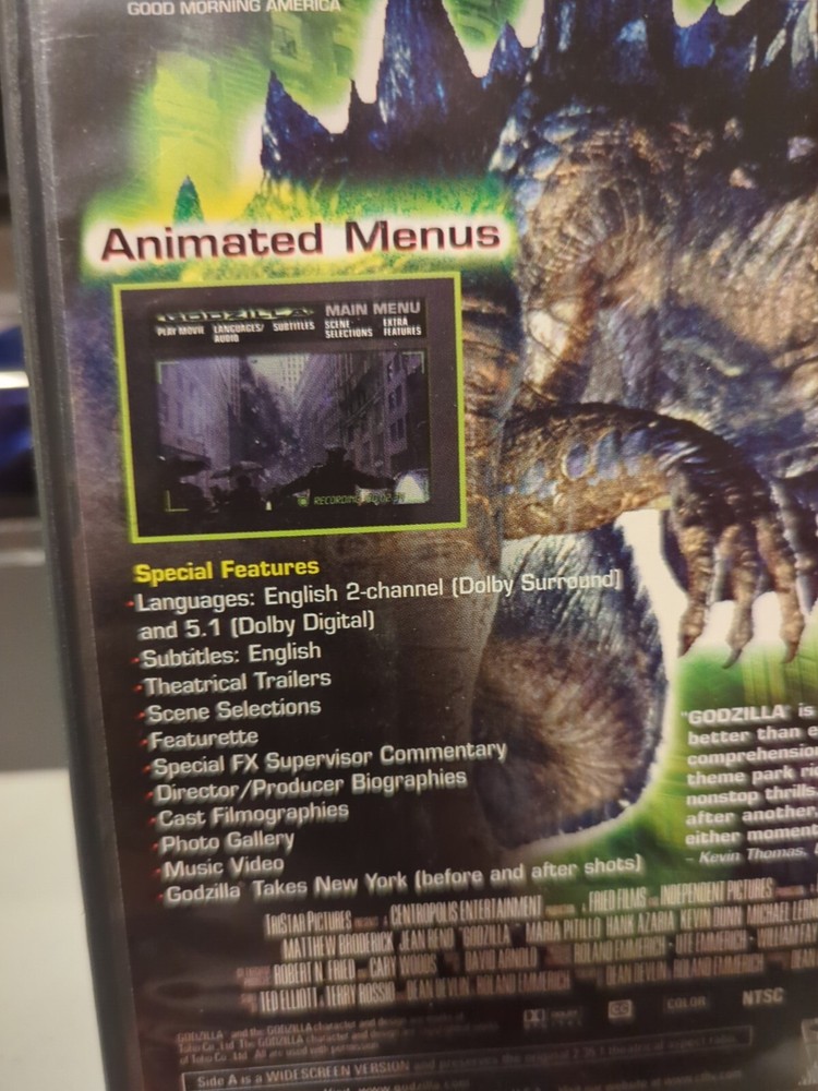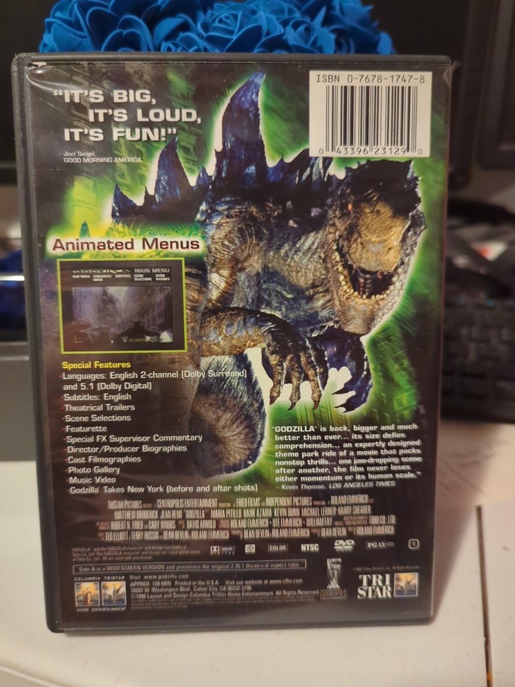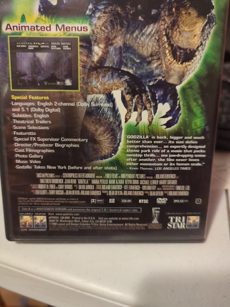 Get ready to witness the iconic Godzilla in a Deluxe Widescreen Presentation with this DVD. Released in 1998, this Science Fiction Horror film is rated PG-13 and features the legendary Godzilla in all its glory. The DVD format ensures that you can enjoy this movie in the comfort of your own home and with Widescreen features, you'll get the best viewing experience possible. This DVD is brought to you by Sony Pictures and is a must-have for any fan of the Godzilla franchise. The movie/TV title is a classic and is sure to impress any sci-fi enthusiast. So, get your hands on this amazing DVD and enjoy the thrill and excitement of Godzilla like never before. All Clothing and fabric items have been cleaned/steamed and/or washed per Ebay standards