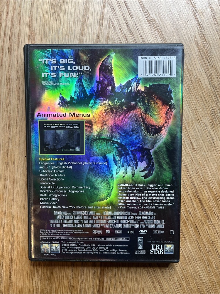 Experience the thrill of the classic science fiction horror movie, Godzilla, on DVD. Directed by Roland Emmerich and released in 1998 by Sony Pictures, this PG-13 rated film is a must-watch for fans of the genre. The movie follows the story of Godzilla, a massive monster that battles its way through Tokyo in a terrifying display of power and destruction. This DVD is perfect for collectors and fans of the movie. With a sub-genre of horror and a genre of science fiction, it's sure to be a hit with anyone who loves a good monster movie. The format is DVD, and the release year is 1998. Don't miss out on the chance to own this iconic film.