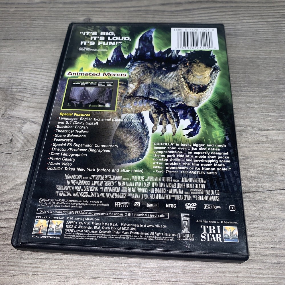 "WILL COMBINE SHIPPING Godzilla" is a science fiction horror film directed by Roland Emmerich, released on DVD in 1998 by Sony Pictures. The movie is rated PG-13 and features the iconic monster wreaki...