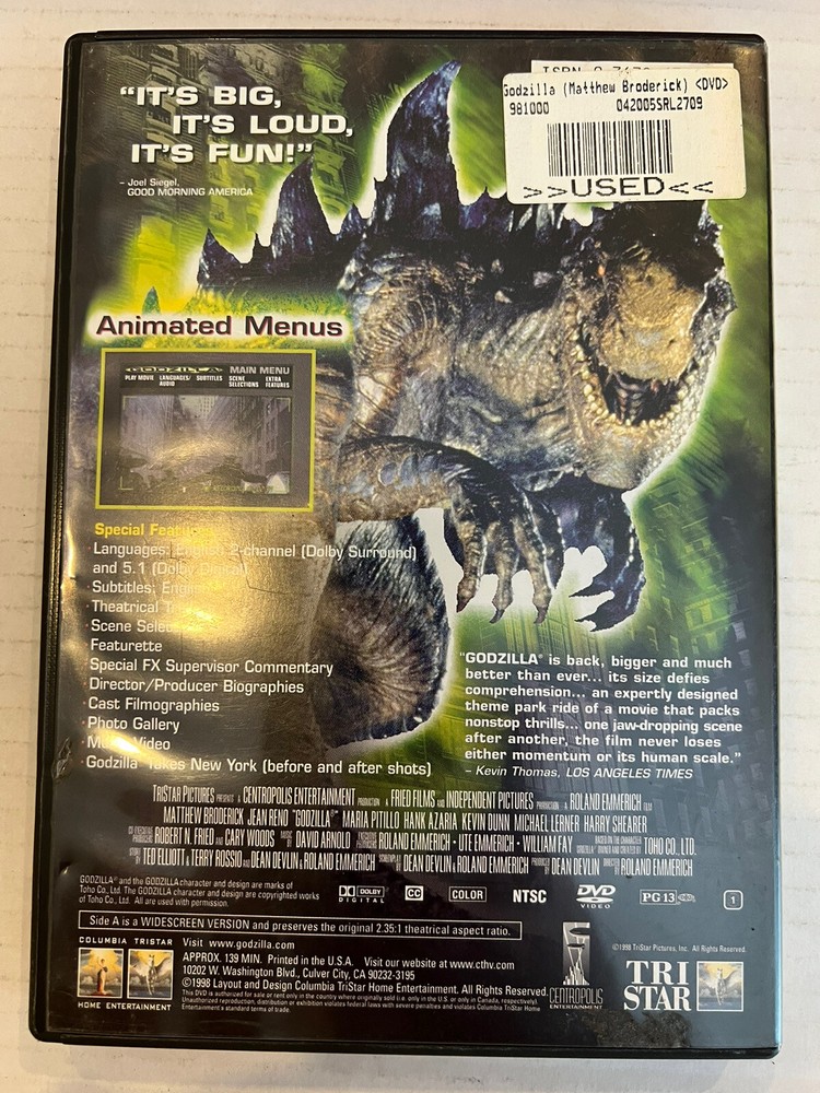 This DVD is a must-have for any Godzilla fan! The 1998 widescreen version delivers great visuals and nostalgic fun. The disc is in excellent condition, plays smoothly, and the action scenes still hold up. Perfect addition to a movie collection—highly recommended for fans of classic monster flicks!
