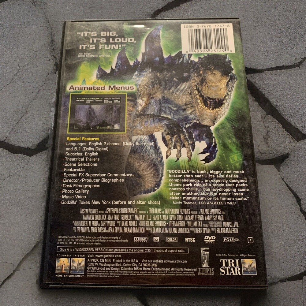 Experience the thrill of the 1998 blockbuster hit, Godzilla, in DVD format. Directed by Roland Emmerich and rated PG-13, this science fiction horror film is a must-watch for fans of the genre. The DVD comes with a protective case and is tested to ensure clean playback. Immerse yourself in the world of Godzilla and witness the epic battle between the legendary monster and the city of Tokyo. This DVD is perfect for collectors and fans alike, and is a great addition to any movie collection. Don't miss out on the chance to own this classic film, order now and enjoy free same day shipping.