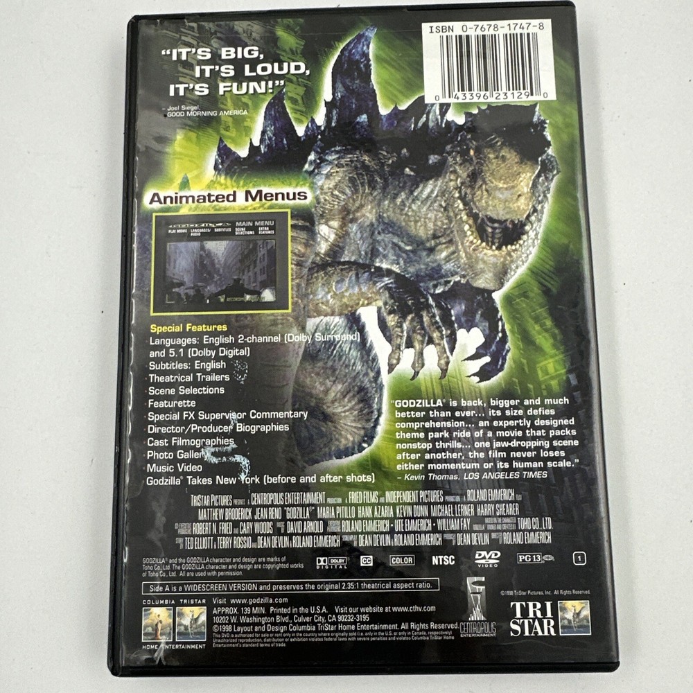 Experience the fear and destruction of the iconic monster in this classic science fiction film. Starring in a PG-13 rated horror movie, the legendary creature wreaks havoc on a major city in an epic battle against humanity. This DVD, released by Sony Pictures in 1998, is a must-have for fans of the genre. Featuring the unforgettable storyline and impressive special effects, Godzilla is a timeless classic that will leave you on the edge of your seat. This DVD edition is perfect for collectors and enthusiasts alike, and will provide you with hours of entertainment. Don't miss your chance to own a piece of movie history with Godzilla!