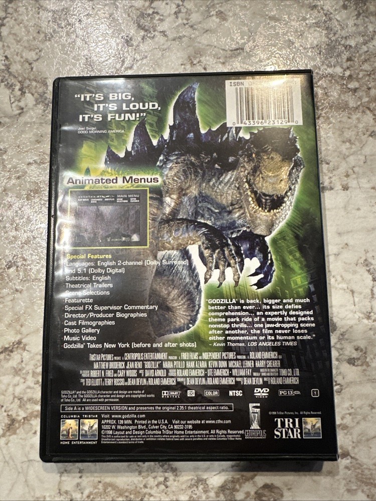 "Godzilla" is a science fiction horror film directed by Roland Emmerich, released on DVD in 1998 by Sony Pictures. The movie has a PG-13 rating and follows the story of a giant lizard-like monster wre...