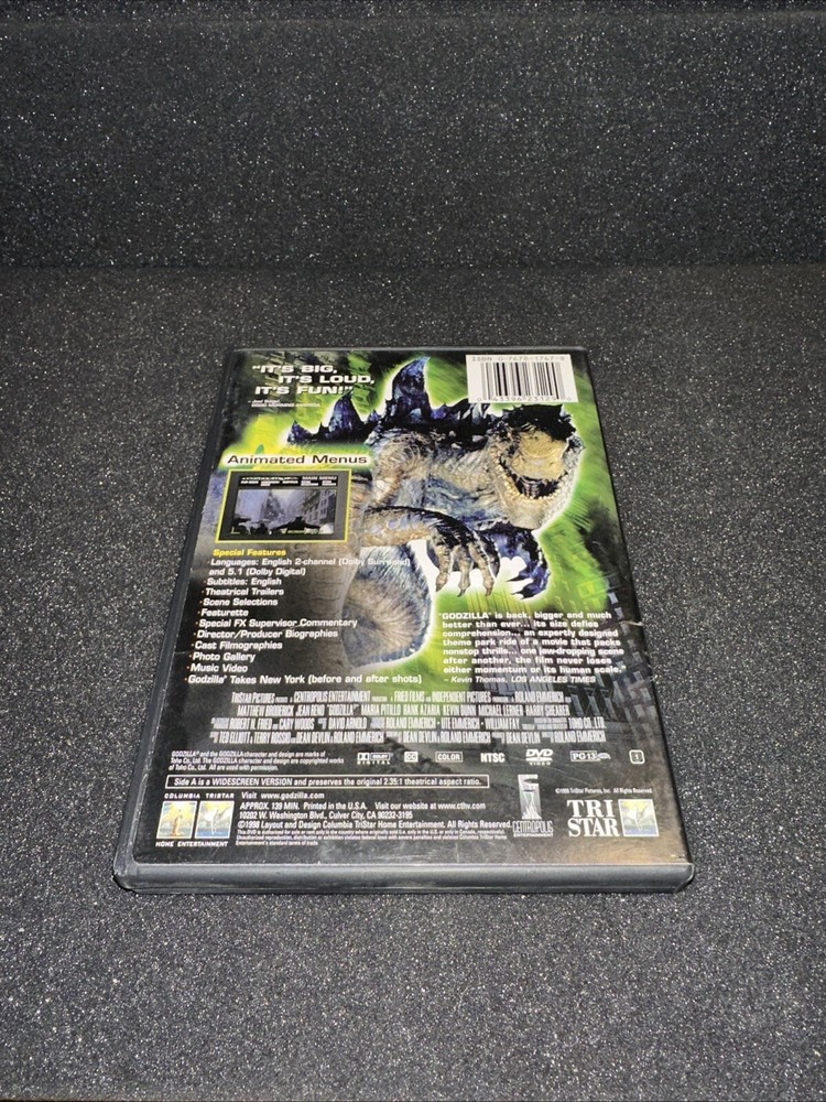 This DVD release of the 1998 movie "Godzilla" is a must-have for fans of science fiction and horror. Directed by Roland Emmerich, this PG-13 rated film is sure to entertain with its thrilling storyline and captivating special effects. Sony Pictures studio brought this monstrous masterpiece to life and fans of the genre will not be disappointed. With its release format of DVD, this movie is a great addition to any collection. Get your hands on this thrilling adventure today!