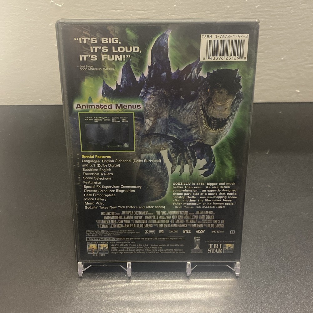 "Godzilla" is a science fiction horror film directed by Roland Emmerich and released on DVD in 1998 by Sony Pictures. The movie has a PG-13 rating and follows the iconic monster Godzilla as it wreaks ...