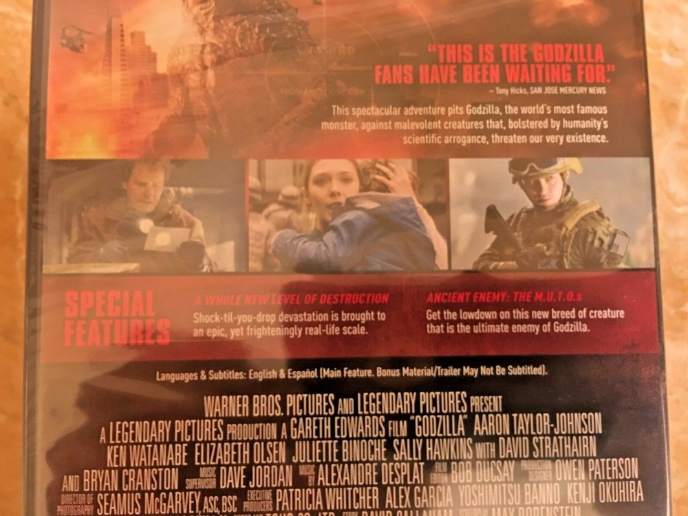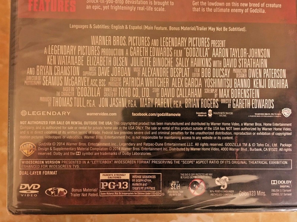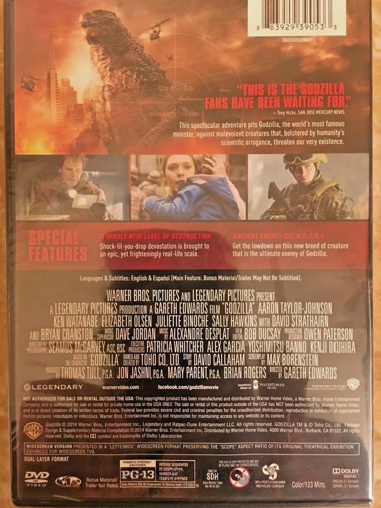 Item specifics: THIS PRODUCTION IS ORIGINAL NOT A COPY OR CHEEP IMPORT, IT COMES WITH AN EXTRA BONUS DISC LOADED WITH SPECIAL FEATURES, SEALED AND BRAND NEW! Godzilla The king of all monsters returns in this Warner Bros./Legendary Pictures production helmed by Gareth Edwards (Monsters). As the story opens in Japan, we find dedicated nuclear power-plant manager Joe Brody (Bryan Cranston) so caught up in his work that he forgets it's his birthday. Sending his young son Ford off to school before reporting to the plant with his wife Sandra (Juliette Binoche), who works in the reactor, Joe begins to suspect that some suspiciously patterned seismic activity may be something more sinister than shifting tectonic plates He's right, too, because when the plant goes into meltdown mode and Sandra gets caught on the wrong side of the containment door, a massive cover-up ensues. Fifteen years later, Ford (Aaron Taylor-Johnson) has become a bomb-disposal expert in the U.S. military. He's just returned home to his wife Elle (Elizabeth Olsen) and their son Sam (Carson Bolde) when he gets word that Joe been arrested in Japan. Long estranged from his father, who was written off as a conspiracy theorist for his failed efforts to prove the Japanese government was attempting to hide something about the earlier disaster, Ford nevertheless ventures to Japan to get him out of jail, and reluctantly agrees to join him in traveling to their old home in the quarantined zone. Subsequently taken into custody, the pair end up in the very plant where Joe used to work, and where scientists Dr. Ichiro Serizawa (Ken Watanabe) and Vivienne Graham (Sally Hawkins) are studying a massive cocoon-like structure that appears to feed on radiation. The situation turns critical when the events of the present begin to mirror those of the past, and a terrifying winged-creature dubbed a "MUTO" is unleashed. Meanwhile, as the military attempts to devise a plan to destroy the beast, signals indicate that it had been calling out to something before it broke free, and the scientists learn that it has awoken a towering, godlike leviathan that has lied dormant for centuries, and may be mankind's only hope for restoring the balance of nature. Condition: Brand New: An item that has never been opened or removed from the manufacturer’s sealing (if applicable). Item ... Read moreabout the condition Leading Role: Aaron Taylor-Johnson, Elizabeth Olsen, Bryan V.I.P by Cranston, Ken Watanabe, David Strathairn, Juliette Binoche Format: DVD Director: Gareth Edwards Rating: PG-13 UPC: 0883929388462 Product Details: THIS IS AN ORIGINAL NO ONE ON LINE HAS THIS EDITION DVD AND CASE IT IS EXTRA RARE! Edition Includes Digital Copy; UltraViolet Number of Discs 2 Rating PG-13 (MPAA) Film Country USA UPC 8839293390533 Additional Details Genre Action/Adventure Format DVD Display Format DUE TO THE VIRUS GOING AROUND WE ARE TAKING EXTRA CARE TO WIPE DOWN AND CLEAN ALL OF THE ITEMS BEFORE WE PACKAGE AND SHIP OUT. STAY HEATHLY AND THANK YOU FOR BUYING AND YOUR INTEREST. ~~~!!! SAME DAY SHIPPING !!!~~~