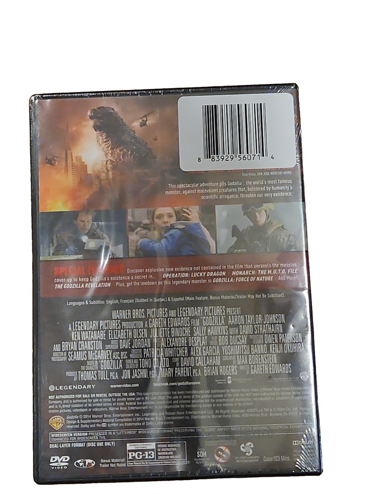 Experience the thrill of the legendary monster with this DVD of the 2014 film "Godzilla". This action-packed movie features incredible special effects and an all-star cast including Aaron Taylor-Johnson and directed by Gareth Edwards. The bonus disc included in this package offers even more behind-the-scenes looks and special features. This DVD is brand new and still sealed, ready to be enjoyed by any fan of the sci-fi and fantasy genre. With English language and a PG-13 rating, this movie is perfect for any movie night with friends or family. Don't miss out on this opportunity to own a piece of cinematic history.
