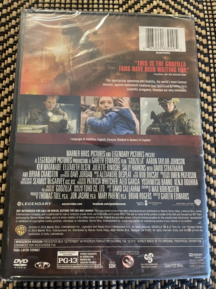 The product is a DVD of the movie "Godzilla" released in 2014, directed by Gareth Edwards. It falls under the genre of Science Fiction and belongs to the sub-genre of Horror, with a PG-13 rating. The DVD is in Tall/DVD Case format with a run time of 123 minutes, featuring English, French, and Spanish subtitles. The film stars Ken Watanabe, Bryan Cranston, and Elizabeth Olsen in lead roles and is distributed by Warner Home Video in a Standard Edition package.