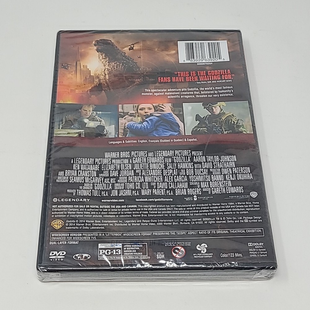 Godzilla (DVD, 2014) Ken Watanabe Bryan Cranston Elizabeth Olsen NEW SEALED Thank You! Shipping: I use USPS Priority Mail, First Class and Media Mail (for books etc.) I also use the Global Shipping Program and additional International Shipping options (like International Priority Mail and International First Class) My return policy: If you are not satisfied with your order you can return the item within 30 days of receiving item. Please make sure you send the item back as it was received and I will issue a full refund upon receiving the item. If you have any issues at all please contact me and let me know. I thrive to make sure you are happy with your order.