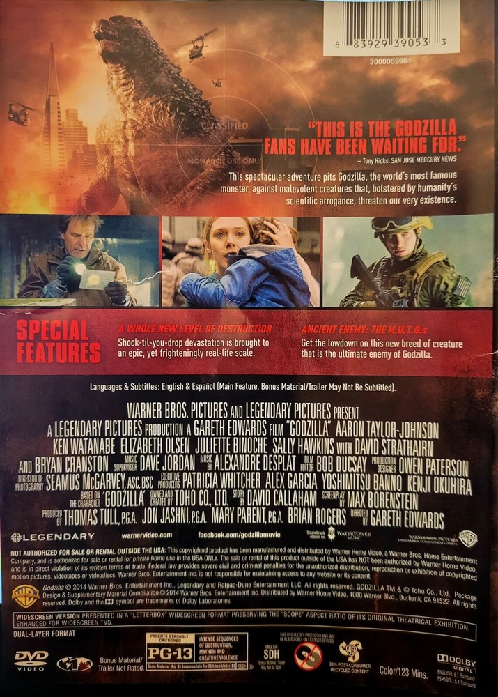 In 1999, the Janjira nuclear plant was mysteriously destroyed with most hands lost including supervisor Joe Brody's colleague and wife, Sandra. Years later, Joe's son, Ford, a US Navy ordnance disposal officer, must go to Japan to help his estranged father who obsessively searches for the truth of the incident. In doing so, father and son discover the disaster's secret cause on the wreck's very grounds. This enables them to witness the reawakening of a terrible threat to all of Humanity, which is made all the worse with a second secret revival elsewhere. Against this cataclysm, the only hope for the world may be Godzilla, but the challenge for the King of the Monsters will be great even as Humanity struggles to understand the destructive ally they have. Pre-owned, condition is very good. Please see all photos.