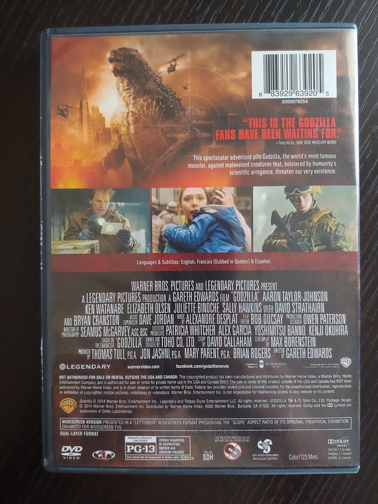 Only played once. Handled lightly. 2014 DVD of Gareth Edwards' American Godzilla with Bryan Cranston and Aaron Taylor Johnson. DVD case, cover and disc are in perfect condition....