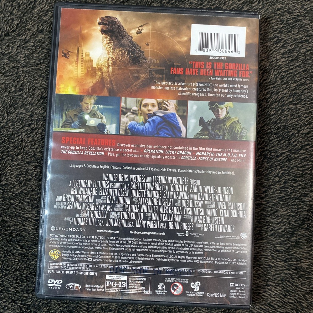 The product is the DVD release of the 2014 film "Godzilla" directed by Gareth Edwards. This PG-13 rated movie falls under the genres of Sci-Fi-Contemporary and Horror-Monsters. With a run time of 123 minutes, it is presented in English and produced by Warner Home Video. The DVD format allows viewers to enjoy the thrilling story and impressive special effects of this modern reimagining of the iconic Godzilla franchise.