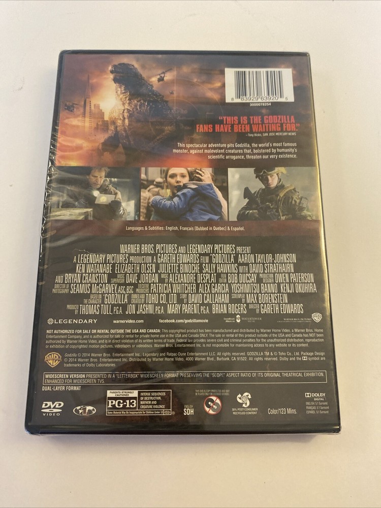 Experience the thrill of the classic horror movie "Godzilla" in this DVD release from 2014. Directed by Gareth Edwards, this science fiction film features a run time of 123 minutes and a PG-13 rating. The DVD includes options for English, French, and Spanish language with subtitles in the same languages. The movie follows the story of a catastrophic event that leads to the emergence of a massive, destructive creature. Aspects of the DVD include the format being DVD, the studio being Warner Home Video, and the sub-genre being horror. Get ready to witness the intense action and drama of "Godzilla" and order your copy today.
