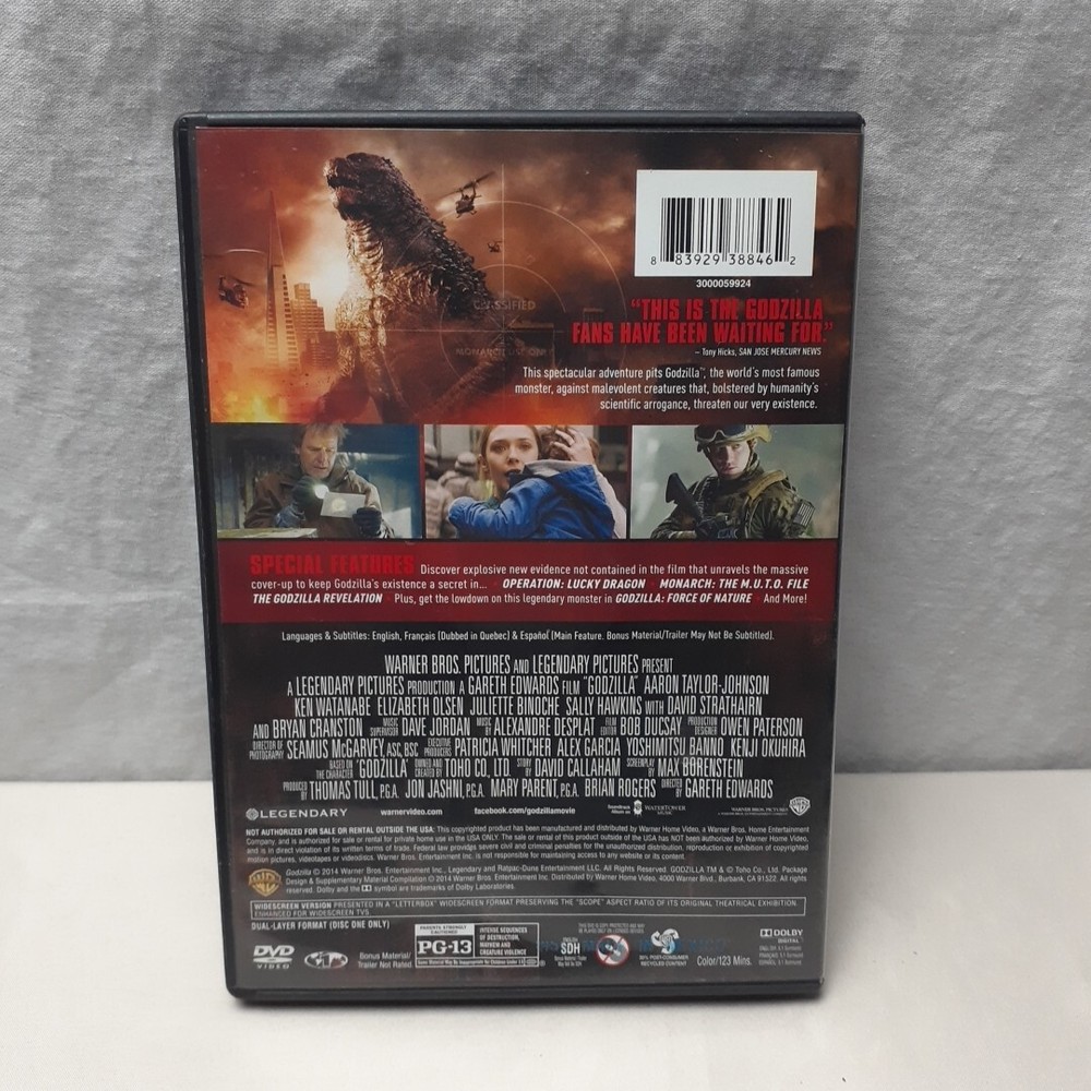 Godzilla DVD Aaron Taylor-Johnson Experience the epic battle of Godzilla in this like-new DVD featuring Aaron Taylor-Johnson. Immerse yourself in a world of monstrous creatures, science fiction, and contemporary action as you witness the thrilling story unfold. This DVD includes English, French, and Spanish subtitles for an enhanced viewing experience. Released in 2014, this PG-13 rated film directed by Gareth Edwards, runs for 123 minutes and is brought to you by Warner Home Video. Get ready to be transported to a world of adventure and excitement, where Godzilla reigns supreme. Don't miss out on the chance to own this must-have DVD for any Sci-Fi or Monster movie fan. Minor light scratches Combined shipping offered All items are packed fresh and properly for guaranteed secure delivery 📬 Any other questions, comments, concerns, please contact me right away by hitting the contact seller button below. I'm extremely responsive. My goal is to grow this into something bigger and better, and to make sure all customers are fully satisfied and comfortable with their purchases. Thank you all for your patronage and feel free to browse my store, items are being added daily.
