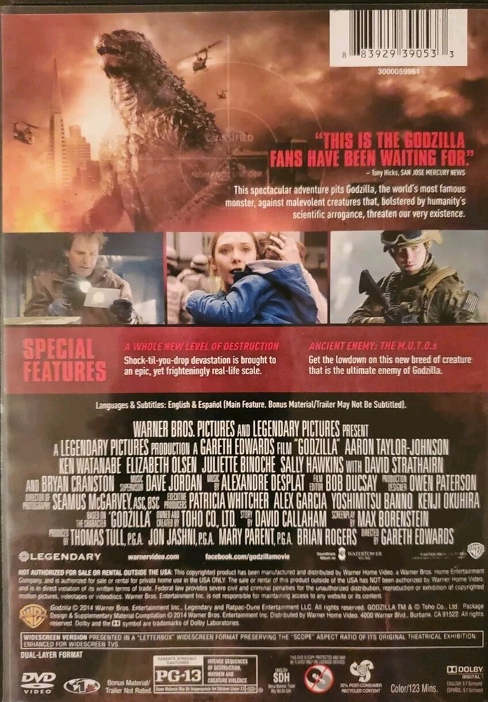 Experience the thrill of the legendary Godzilla with this DVD. The movie, released in 2014, is rated PG-13 and is in English language. This DVD is in the format of a disc and is pre-owned. The studio behind this movie is Warner Bros. and the movie's title is 'Godzilla'. This DVD is perfect for fans of the iconic Godzilla character. It is a great addition to any movie collection and is sure to impress with its stunning visuals and heart-pumping action. Don't miss out on the chance to own this amazing DVD.