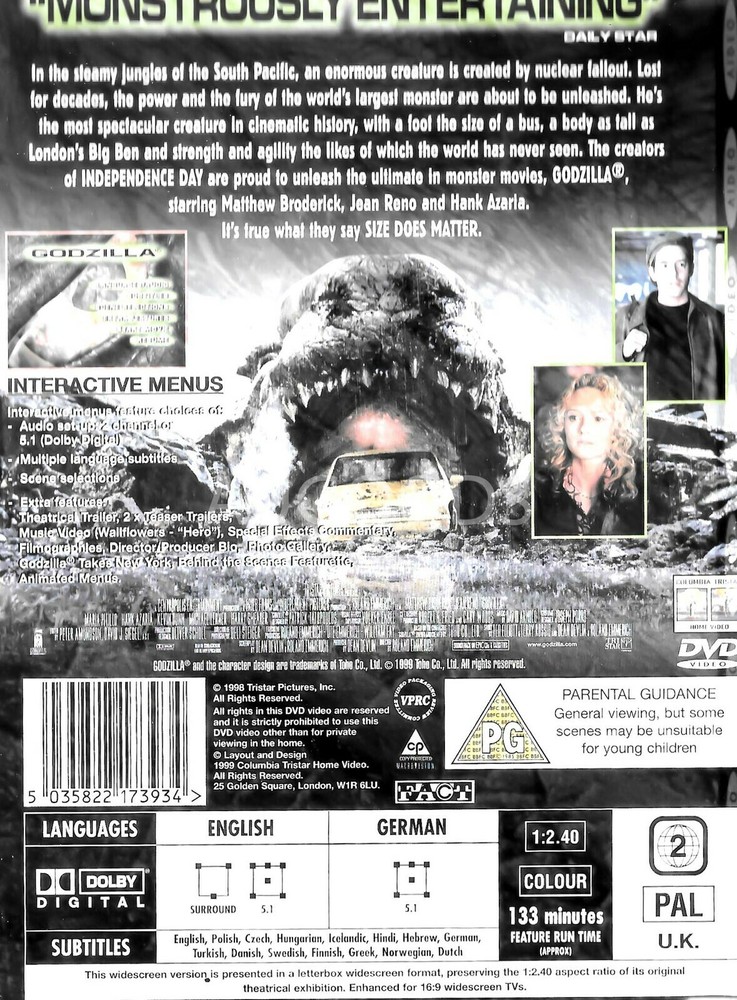 FAST SHIPPING HASSLE FREE RETURNS SECURE PAYMENT EXCELLENT SERVICE This film is Preowned and slip may have some wear, Disc is in Excellent condition Godzilla Region: 2 Shipping Please make sure to double check your shipping and address information before you confirm and pay. Where do you ship? Currently, we ship online purchases Australia wide. How long till my item gets dispatched? In most cases, orders made before 2 PM will be dispatched same day or within 24 hours. In some cases, handling time may take longer. If this is the case, specific handling time will be displayed explicitly in the listing. How long until I get my order? Unless you live in a remote area, most orders will be delivered within 2-5 business days at your destination, remote areas may take a little bit longer. Who are my items shipped with? We use Australia Post, Couriers Please and Fastway for standard, registered and express shipping for orders up to 21kg. Payment How can I pay for my item? We offer convenient, safe and speedy payment via PayPal. PayPal helps protect your information with industry-leading security and for protection systems. When you use PayPal, your financial information is never shared with the 3rd party merchant. Within PayPal you may have the option to pay with a Credit Card, Bank Account, eCheck, or other payment options. Return Can I return my items? Yes. We accept accepts returns on Damaged or incorrect orders for up to 30 days. Faulty or Damaged Items If your item arrives faulty or not as described then you can return it to us within 30 days of purchase for a full refund. Changed your mind? If you change your mind about your item, As long as the item is still in factory sealed new condition it may be sent back to us within 30 days of purchase. The item must still be in its original condition and packaging.In these cases the customer will be responsible to pay the return postage. DESCRIPTION CLICK HERE TO SEE OUR MORE IN OUR STORE This film is Preowned and slip may have some wear, Disc is in Excellent condition Godzilla Region: 2 The makers of 'Independence Day' return with a big-budget makeover of the Japanese monster movies. Godzilla is a huge reptilian monster, a terrible genetic mutation caused by the French nuclear tests in the Pacific. Making her way to New York, the amphibian terror threatens the city with complete destruction. Scientist Niko Tatopoulos (Matthew Broderick), a TV reporter (Maria Pitillo) and a team of French special agents (including Jean Réno) are the Big Apple's only hope as an even more horrific scenario unfolds: Godzilla is planning to have babies. GUARANTEE We guarantee all items are genuine studio release products - no copies, counterfeit or faulty versions. If there is an issue with the playback of the item (the item is faulty), please contact us within 7 days of receipt so that we can resolve the issue for you. Please note, this does not include instances where you've purchased say, a region 2 DVD and it won't play in your region 4 player. You must check first that your player can play the region of the disc you are about to purchase. CANCELLATION I Have already checked out, can I cancel my order? We will be able to cancel your order if it has not been dispatched yet. Send us a message as soon as possible and we will do our best to cancel your order before it gets sent out. My order has been dispatched, can I cancel my order? If your item has already been sent out, you are able to return it to us under our Return Policy. As long as the item is still in factory sealed new condition it may be sent back to us within 30 days of purchase. The item must still be in its original condition and packaging.In these cases the customer will be responsible to pay the return postage. CONTACT More Questions? If there is any problem, please contact us. We would rather issue a refund or a replacement item than have an unhappy customer. Our customers come first and we would love to hear from you. Feel free to CONTACT US at any time with any questions or concerns and we will be more than glad to assist you. Copyright © | All Rights Reserved