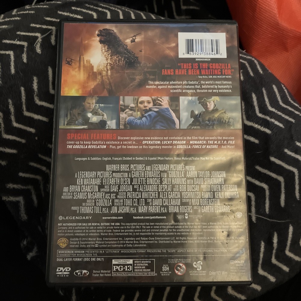 This Godzilla DVD is a must-have for fans of action, adventure, and science fiction. The 2014 movie directed by Gareth Edwards features Aaron Taylor-Johnson and is rated PG-13. With a run time of 123 minutes, this DVD is sure to keep you entertained. The case of this DVD is a tall/DVD case and it includes subtitles in English, French, and Spanish. Produced by Warner Home Video and Thomas Tull, this DVD is in English language and was manufactured in the United States. Add this incredible movie to your collection today!