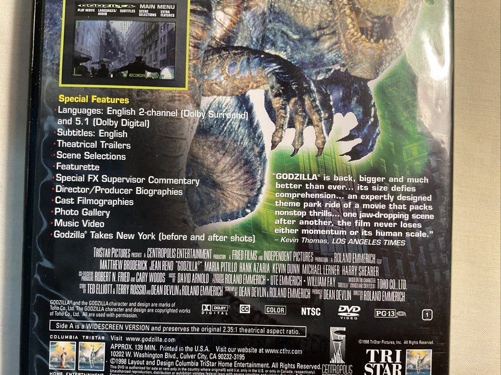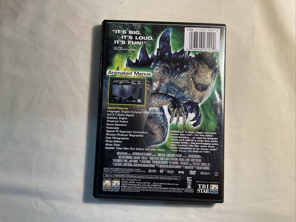This Godzilla DVD is a must-have for any fan of the iconic movie monster. With stunning visuals and heart-pumping action, this DVD is sure to provide hours of entertainment. The format is unknown, but the quality of the DVD is undeniable. The movie/TV title is also unknown, but the thrill of the Godzilla franchise is enough to make up for it. This DVD is perfect for collectors or anyone looking for a fun movie night. Get ready to witness the destruction of entire cities as you watch the legendary Godzilla battle its way through unknown opponents. THIS OWNER TAKES VERY GOOD CARE OF HIS THINGS.