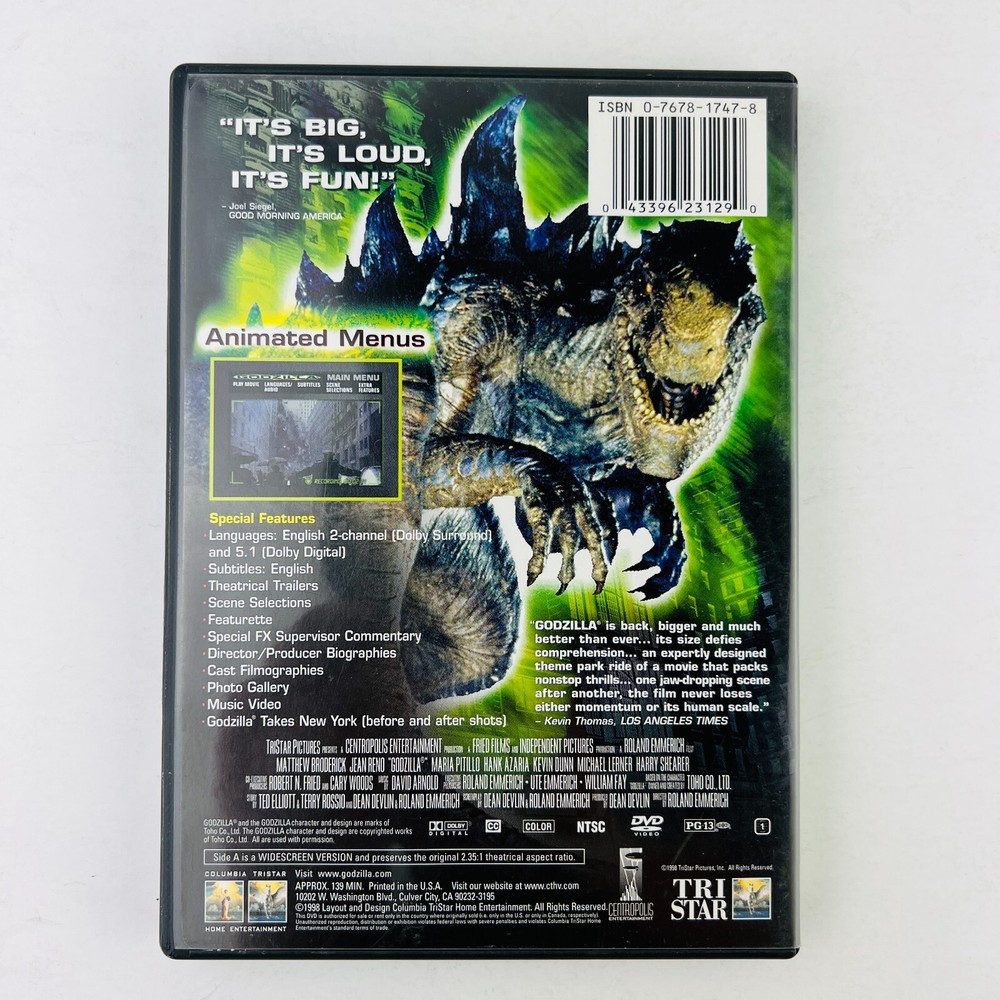 This listing is for Godzilla Deluxe Widescreen Edition DVD. Actors: Matthew Broderick, Jean Reno, Maria Pitillo, Hank Azaria, Doug Savant Director: Roland Emmerich Producers: Dean Devlin Aspect Ratio: 2.35:1 MPAA rating: PG-13 (Parents Strongly Cautioned) Media Format: AC-3, Multiple Formats, Anamorphic, NTSC, Special Edition, Color, Widescreen, Closed-captioned, Subtitled, Dolby Run time: 2 hours and 19 minutes Release date: November 3, 1998 Language: English (Dolby Digital 2.0 Surround), English (Dolby Digital 5.1) Dubbed: French Subtitles: English Studio: Sony Pictures Home Entertainment Country of Origin: USA Number of discs: 1 Following the French atomic bomb tests in the South Pacific, an unknown creature is spotted passing westward through the Panama Canal. Scientist Niko Tatopolous is called in to investigate the matter, and he quickly arrives at the conclusion that a giant, irradiated lizard has been created by the explosions. Godzilla then makes its way north, landing at Manhattan to begin wreaking havoc in the big city. Even with the combined forces of the U.S. military to fight the monster, will it be enough to save the people of New York? As "gigantic monster reptile attacks New York" movies go, you've got to admit that Godzilla delivers the goods, although its critical drubbing and box-office disappointment were arguably deserved. It's a shameless, uninspired crowd pleaser that's content to serve up familiar action with the advantage of really fantastic special effects, and if you expect nothing more you'll be one among millions of satisfied customers. There's really no other way to approach it--you just have to accept the fact that Independence Day creators Roland Emmerich and Dean Devlin are unapologetic plagiarists, incapable of anything more than mindless spectacle that can play in any cinema in the world without dubbing or subtitles. The whole movie plays out like a series of highlights stolen from previous blockbusters of the 1990s; it's little more than a rehash of the Jurassic Park movies. The derivative script is so trivial that it's unworthy of comment, apart from a few choice laughs and the casting of Michael Lerner as New York's mayor, whose name is Ebert and who closely resembles a certain well-known movie critic. Perhaps that's a clever hint that this movie's essentially critic-proof. It's stupid but it's fun, and for most audiences that's a fitting definition of mainstream Hollywood entertainment. The widescreen Special Edition DVD includes a wealth of bonus materials--audio commentary by the film's special effects supervisors, a "making of" featurette, the Wallflowers' music video "Heroes," a photo gallery, and a variety of features related to this and all the classic Godzilla films from Japan. Thanks for checking out this item! We have many related items listed, so be sure to check our other listings for similar items! Reasonable offers are highly considered, unreasonable ones are not...Sorry... :-)! Still have a ton of "not listed" inventory, so if you looking for something specific, please inquire as we may just be able to find it for you. We ship 6 days a week, so the faster you pay, the faster we ship! Thanks again for your visit and even more so if you purchase something! I'm sure you will be as happy as we are! • Combined Shipping - Yes, we can combine shipping! Just add all items to cart and checkout! Shipping fees do adjust for multiple items. • Packaging - eBay and/or Non-branded packaging are used to try and keep costs low and be as recycle friendly as possible. • Shipping Information - We DO NOT offer Pick-up Service, All orders must be shipped. 1. We ship daily (6 days a week), but mail pickup is usually by 10am CST, otherwise ships next day! 2. Items are shipped at the level (speed) of the service you select. So if you want it faster, select a faster shipping service. 3. All orders will be shipped with tracking and will be securely packaged appropriate to the item(s) being shipped. 4. Insurance is provided with PRIORITY Mail (Expedited shipping level). 5. Carriers - Primarily USPS, but will use UPS and/or FedEx if item requires or is a better fit for their networks. 6. Sellers are not responsible for service transit time. Transit times are provided by the carrier, exclude weekends and holidays, and may vary with package origin and destination and/or SERVICE LEVELS, particularly during peak (Holiday) periods. (Sellers have NO control over the CARRIERS) 7. Domestic (U.S.A.) Shipping - Domestic (all 50 states, U.S. territories, APO/FPO & P.O. Boxes) shipping rates are calculated based on package weight, size, & destination & costs (packaging, fees, time). We ship within 1 business day after cleared payment. 8. International (Worldwide) Shipping - If you are in a country that is eligible for the Global Shipping Program, per our agreement with eBay, we must ship using the Global Shipping Program. Direct shipping costs are prohibitive to buyers. 9. Shipping charges are not refundable under any circumstances, since FREE Returns are offered. • Item Conditions/Returns - UNLESS specifically stated as NEW or LIKE NEW, almost all the items are in used condition. • Payments - The faster you pay, the faster we ship. • Feedback - We will leave 5 Star feedback once the transaction is completed. We leave feedback monthly due to the amount we have to do each month.
