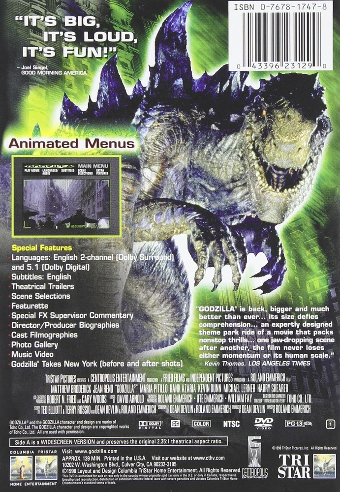 Godzilla The enormous monster descends upon New York, and it's up to the Army and an odd team of investigators to unravel the mystery behind the incredible creature before it's too late. All used DVDs have been refurbished and tested before shipping and should play fine on most machines. Additional Details ------------------------------ Actor: Maria Pitillo, Matthew Broderick, Jean Reno, Harry Shearer, Hank Azaria, Doug Savant Ws or Fs This item is posted and managed courtesy of Bonanza