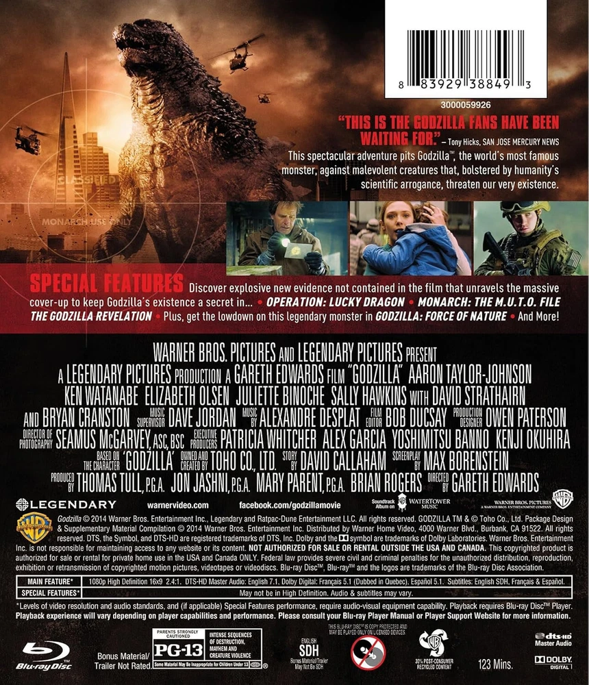 Experience the action-packed adventure of Godzilla (2014 film) on Blu-ray. This factory-sealed Standard Edition features an aspect ratio of 16:9 and a run time of 123 minutes. Directed by Gareth Edwards, the movie stars Elizabeth Olsen, Ken Watanabe, Aaron Taylor-Johnson, and Juliette Binoche. This Blu-ray disc is Region Code A (Americas, Southeast Asia...) and comes with subtitles in English, French, and Spanish. The movie is rated PG-13 and falls under the genre of Action & Adventure with a sub-genre of War. Produced by various producers, the movie is a must-watch for fans of the Godzilla franchise.